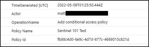 | project TimeGenerated, Actor, OperationName, ['Policy Name'], ['Policy Id']