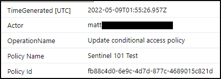The second key part of Conditional Access monitoring is auditing changes. Much like a firewall, changes to Conditional Access policies should be alerted on. Accidental or malicious changes to your policies can decrease your security posture significantly. Any changes to policies are held in the Azure Active Directory audit log table.