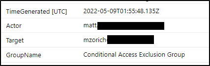 We can see that an ‘Update conditional access policy’ event was triggered. Again, the raw data is hard to read. So jump into the portal and check out what has been configured. Now, one very important note here. If you add a group exclusion to a policy, it will trigger an event you can track. However, if I then add users to that group, it won’t trigger a policy change event. This is because the policy itself hasn’t changed, just the membership of the group. From your point of view you will need to have visibility to both events. If your policy is changed you would want to know. If 500 users were added to the group, you would also want to know. So we can query group addition events with the below query.