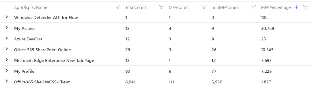 I am sure everyone would love to have MFA everywhere, all the time. The reality is most organizations are still working toward that. As you progress, you may want to target high risk applications. Applications such as control plane management for Azure or Defender services or VPN and remote access portals. Applications with a lot of personal or financial data are always attractive targets for threat actors too. We can use KQL to calculate the percentage of authentications to each application that are covered by MFA.